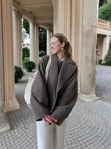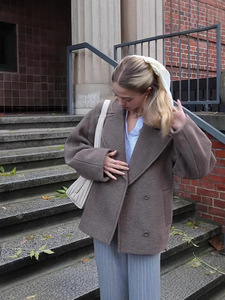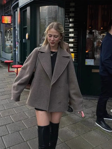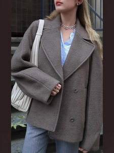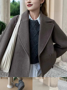 跨境欧美女装速卖通爆款时尚英伦风实心双排扣羊毛翻领长袖短外套
