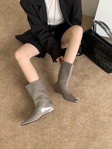 百搭气质低跟骑士靴女春秋韩版简约方头套筒高筒坡跟靴子时尚复古