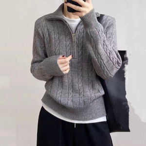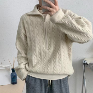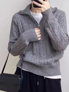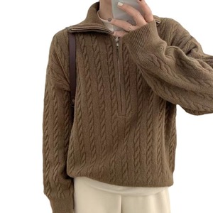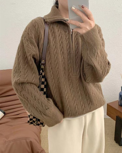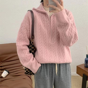 复古麻花套头秋冬新款针织衫翻领设计感韩版宽松半拉链上衣毛衣女