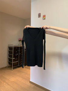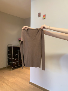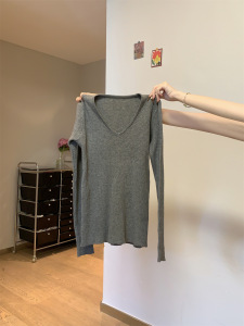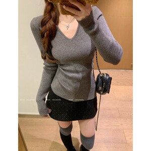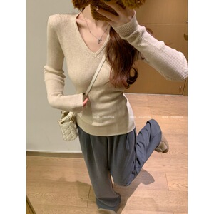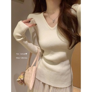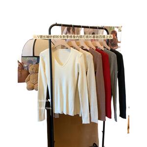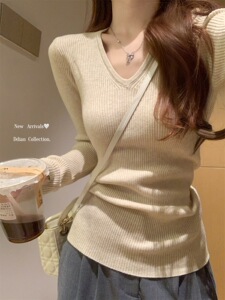 温柔风软糯坑条内搭针织毛衣女2025秋季气质V领简约修身打底上衣