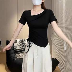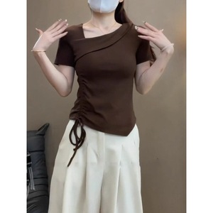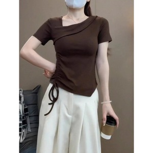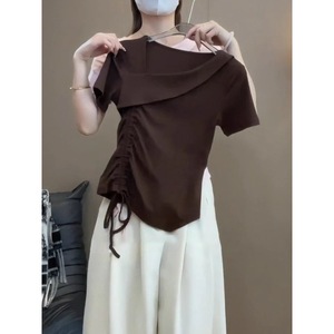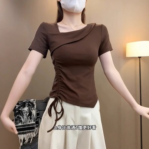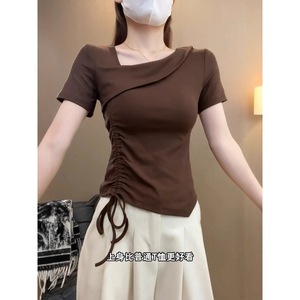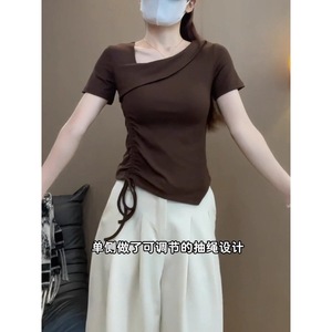 大码咖色设计感抽绳收腰短袖T恤女夏2025新款显瘦不规则正肩上衣