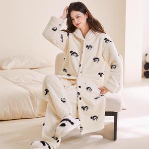 300G秋冬季长款连帽睡衣女珊瑚绒拉链睡衣套装大码熊猫国潮家居服