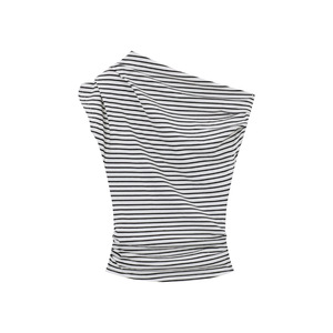 斜肩短袖T恤女2025年新款夏季纯欲辣妹风修身显瘦露肩条纹ins上衣