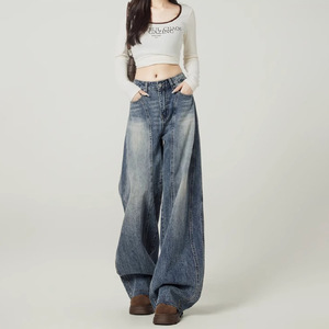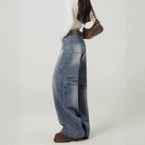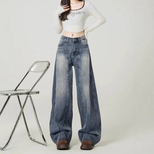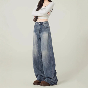 复古蓝阔腿牛仔裤女秋季潮流百搭新款设计感高腰垂感弯刀裤子