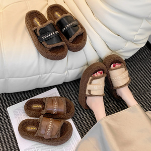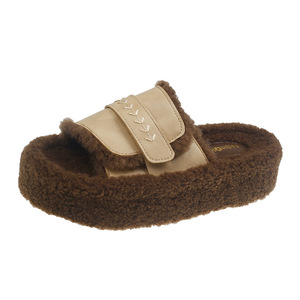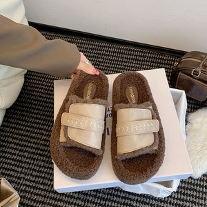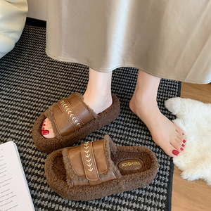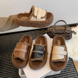 棕博肯鞋女毛毛拖鞋法式高级加绒仙女魔术贴羊羔毛休闲秋冬季外穿