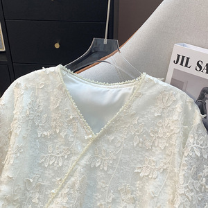 实拍现货春秋季新中式珍珠V领白蕾丝衫衬衫绣花套头长袖宽松上衣