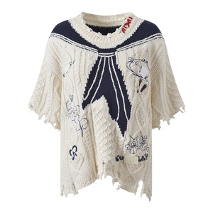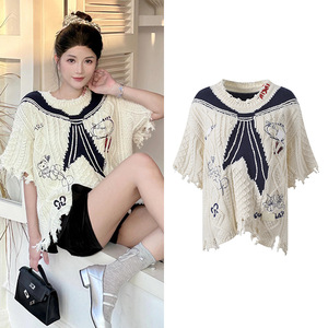 2025秋季新款海军领涂鸦感刺绣破洞毛衫宽松百搭短袖针织衫上衣