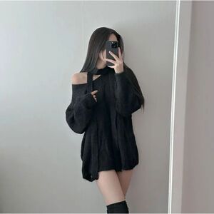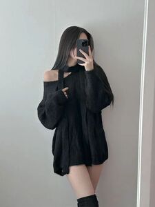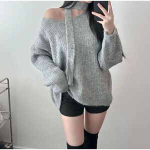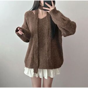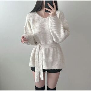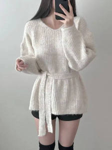 秋冬新款v领慵懒风宽松中长款套头毛衣女收腰绑带气质针织衫上衣