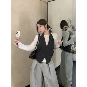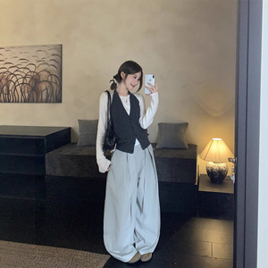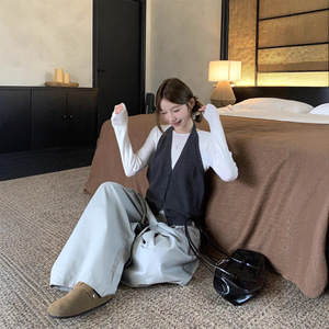 秋季甜美时尚针织打底衫+叠穿针织挂脖背心+垂感阔腿拖地裤套装女