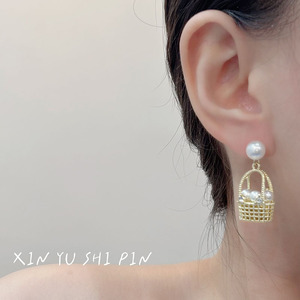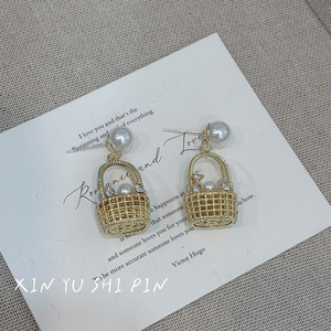 法式复古编织菜篮子珍珠耳环小众个性设计感轻奢时尚高级感耳饰女