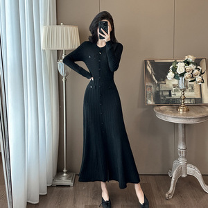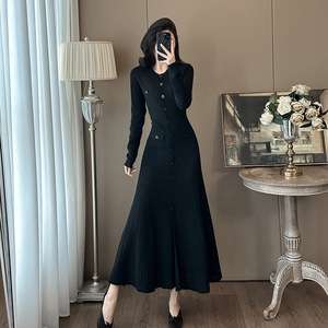 7625法式小香风高级感镂空针织连衣裙女黑色轻奢显瘦气质打底长裙
