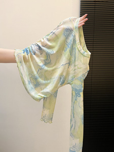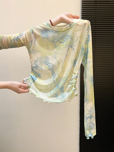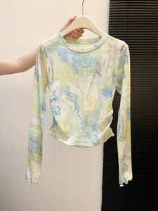 春夏季百搭设计感扎染网纱上衣长袖T恤小个子捏褶收腰短款空调衫