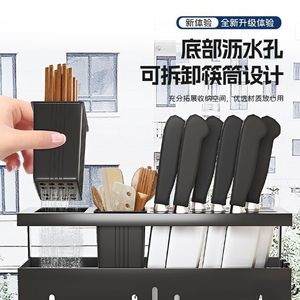 黑色一体式厨房置物架-【双筷筒壁挂款】刀架+挂钩✓⚑