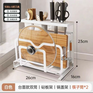 白色一体式厨房置物架-【双筷筒壁挂款】砧板架+锅盖架+挂钩✓⚑