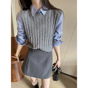 PINKEEN灰色Polo领假两件针织衬衫女秋季2025新款学院风时尚上衣