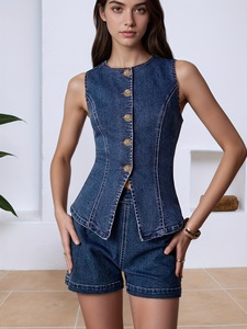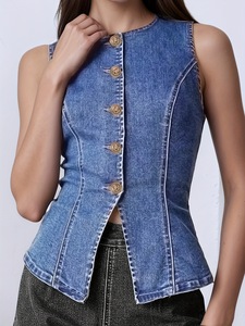 跨境女士牛仔 收腰 弹力背心 立体花扣 无袖马甲(只售上装)