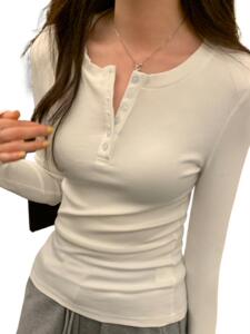 白花灰正肩排扣打底衫女秋季半开领修身甜辣内搭上衣简约长袖T恤