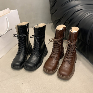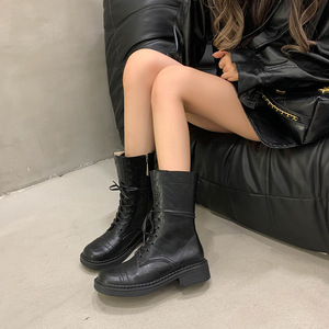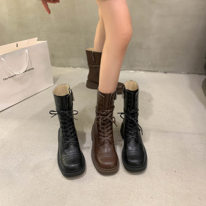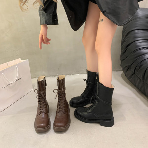 韩式系带英伦风马丁靴潮酷辣妹黑色中筒靴子女擦色显瘦复古瘦瘦靴