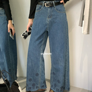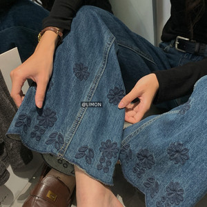 thelimon柠檬绿茶2025秋季新款高腰显瘦镂空刺绣微喇阔腿牛仔裤女