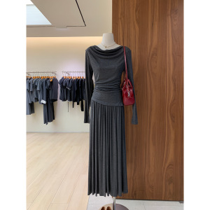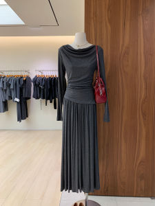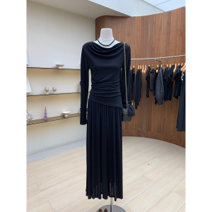 早秋御姐风套装柔软棉荡领长袖T恤+垂感高腰A字大摆半身裙两件套
