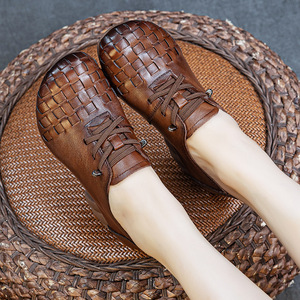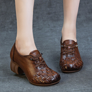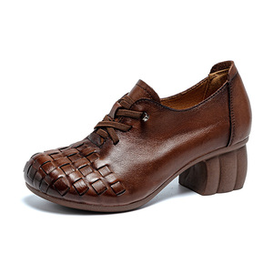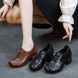 单鞋女2025秋季新款粗跟软底头层牛皮套脚深口鞋复古手工妈妈鞋子