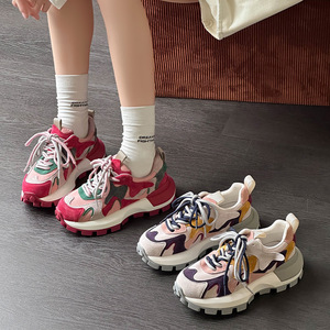 真皮小蛮腰厚底华夫阿甘鞋女2025新款秋季超火运动休闲百搭老爹鞋