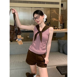 原版面料复古条纹海军领背心吊带女夏季无袖粉咖色设计感别致上衣