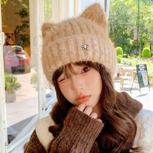 韩版秋冬新款帽子女金属钻标可爱耳朵针织毛线帽冬季保暖护耳帽厚