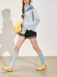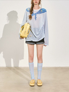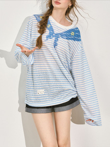 SOMESOE 海军领印花条纹长袖T恤女夏原创设计感美式撞色上衣