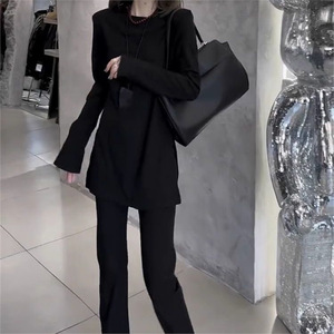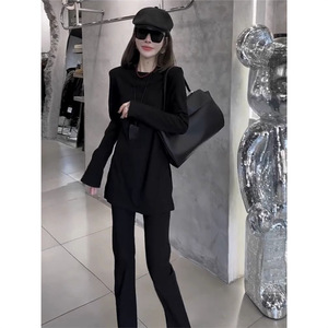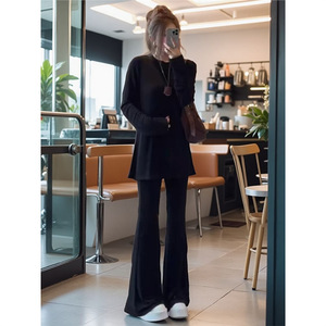 胖mm特大码300斤春秋季时尚休闲简约韩系长袖上衣微喇叭裤套装女