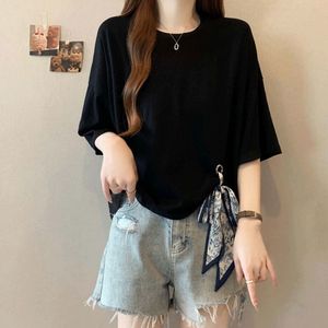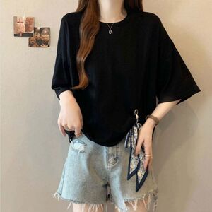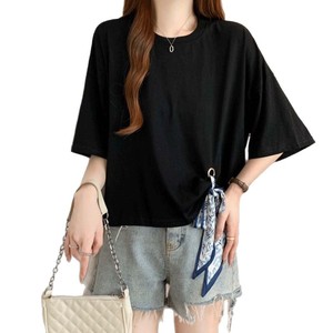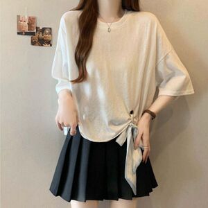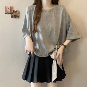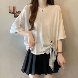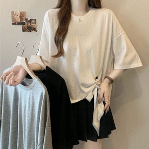 大码不规则绑带小众短袖t恤女夏季2025新款胖mm宽松显瘦遮肉上衣