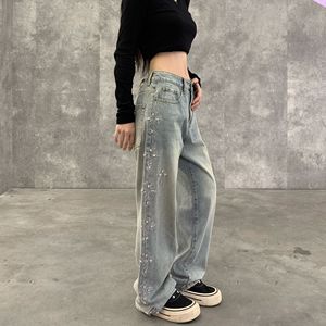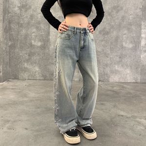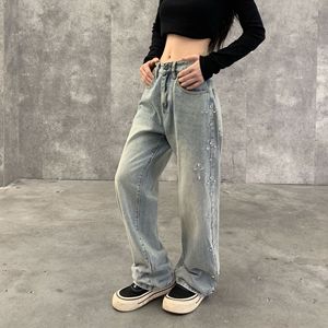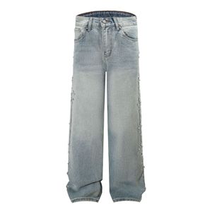 美式高街十字架烫钻牛仔裤男女潮牌复古宽松直筒水洗蓝色阔腿裤子