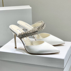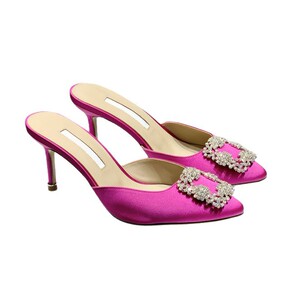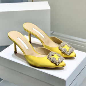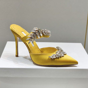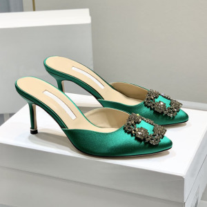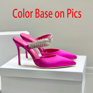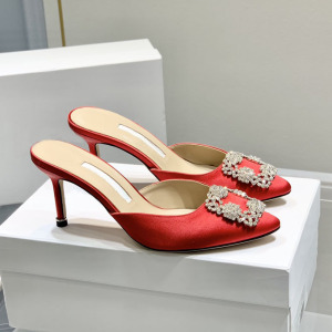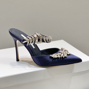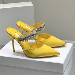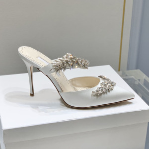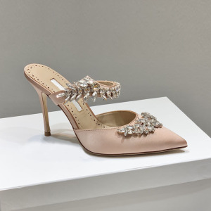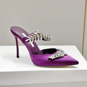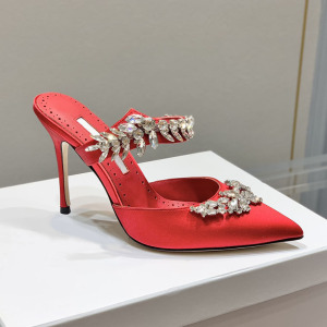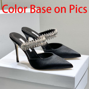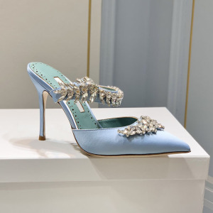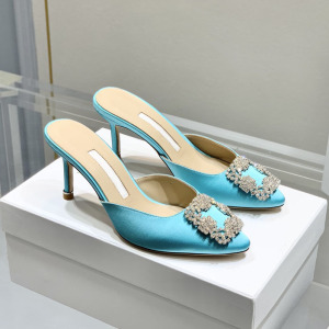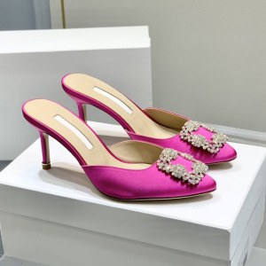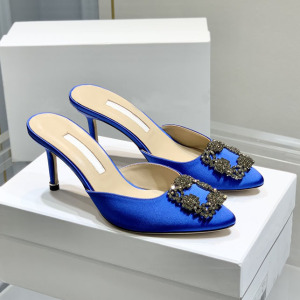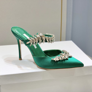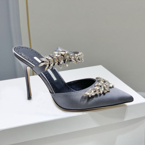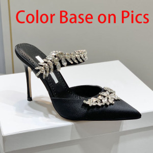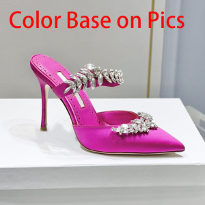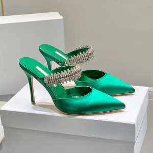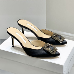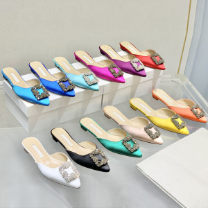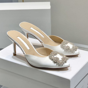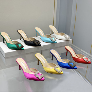 经典mb拖鞋绸缎面雪花水钻方扣尖头外贸大码细高跟包头半拖女凉鞋