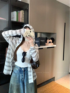 简漫妮条纹连帽长袖外套女早秋防晒罩衫设计感休闲宽松拉链上衣女