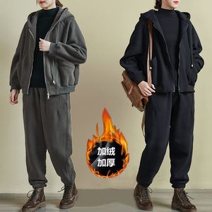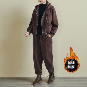 加绒加厚运动套装女秋冬季大码宽松时尚连帽卫衣休闲服两件套