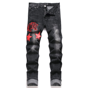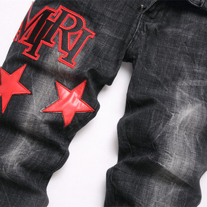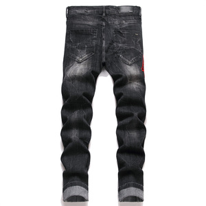 外贸高街风格朋克黑色修身弹力破洞贴布刺绣青少年小脚男式牛仔裤