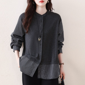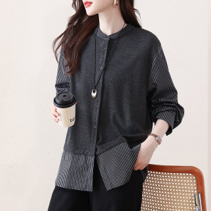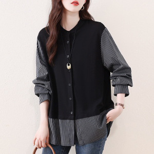 实拍大码2025年秋装新款圆领单排扣条纹撞色中长款长袖衬衫女上衣