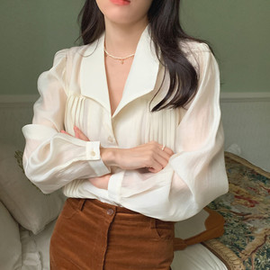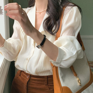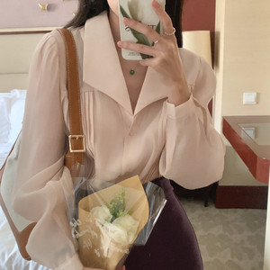 现货实拍 优雅气质香槟色微透长袖衬衫西装领抽褶设计上衣