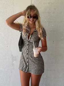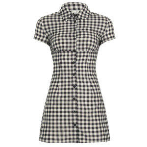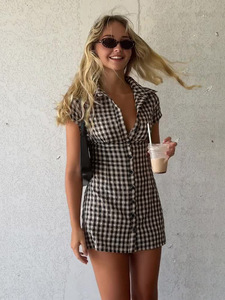 2025夏季新款气质POLO领排扣格纹撞色收腰A字显瘦衬衫短袖连衣裙
