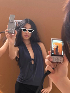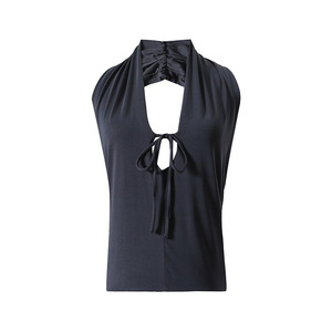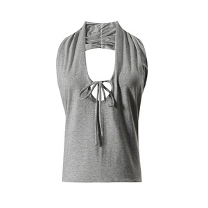 新款深蓝铜氨砂洗质感挂脖上衣灰色棉弹深v系带露背挂脖上衣5326