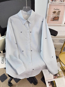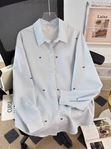 复古细条纹蝴蝶结长袖衬衫外套女春秋新款小个子宽松休闲衬衣上衣