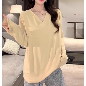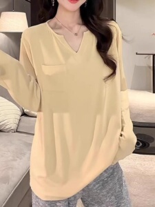 中长款棉V领长袖T恤女2025早秋新款大码胖mm宽松设计感打底上衣