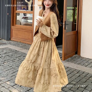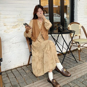 春秋氛围感穿搭2025新款法式碎花连衣裙麂皮绒复古马甲两件套套装