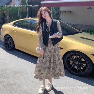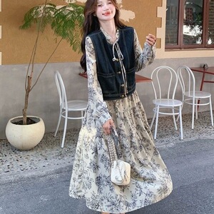 国风水墨画碎花连衣裙女春秋季新款温柔风牛仔马甲长裙套装两件套