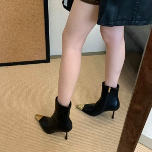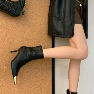24X1高跟短靴女2025新款秋冬金属方头黑色时装细跟法式气质高跟鞋