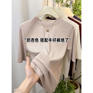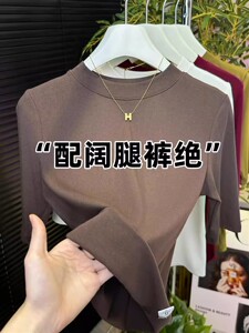 炭黑色小圆领T恤上衣女2025春季新款洋气百搭五分袖内搭打底衫潮