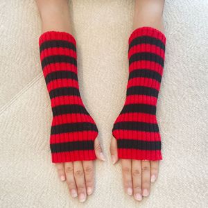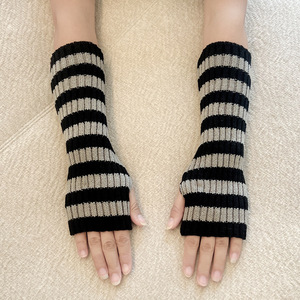 跨境双拼色针织条纹毛线防寒保暖装饰袖套手套中长款露指臂套袖子