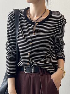 春秋新款条纹针织开衫外套女设计感小众上衣外搭薄款圆领长袖毛衣