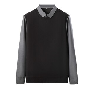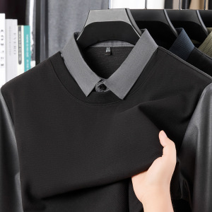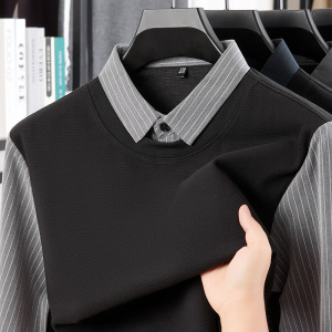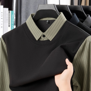 男士休闲条纹假两件针织衫2025秋季新款弹力透气撞色翻领打底上衣