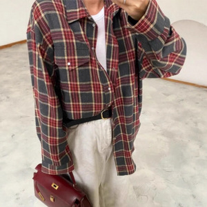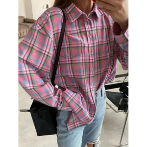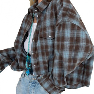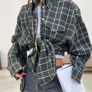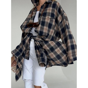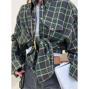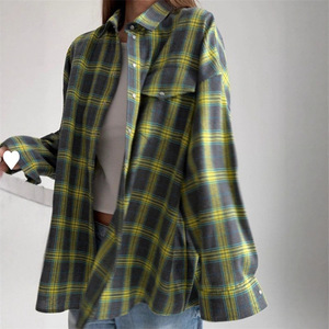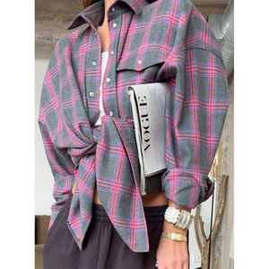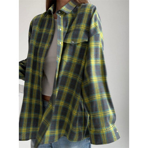 亚马逊跨境2025秋季复古风百搭翻领宽松衬衣格纹长袖口袋女式衬衫
